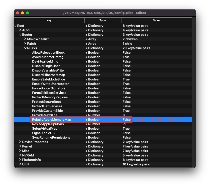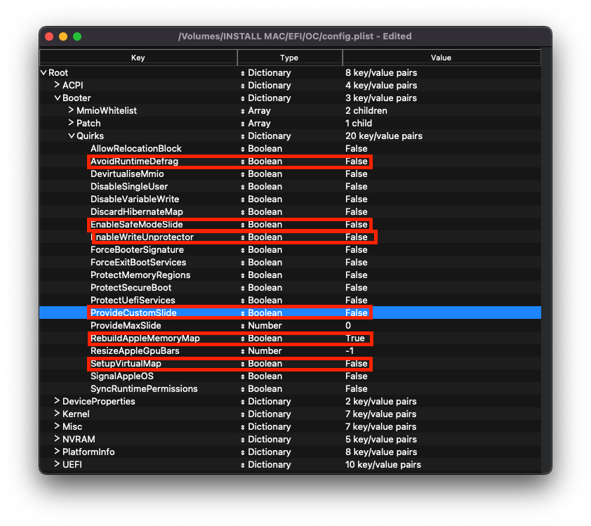 | AvoidRuntimeDefrag | No | Big Sur may require this quirk enabled |