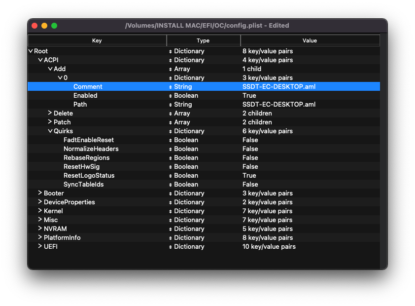 This section allows us to dynamically modify parts of the ACPI (DSDT, SSDT, etc.) via OpenCore. For us, our patches are handled by our SSDTs. This is a much cleaner solution as this will allow us to boot Windows and other OSes with OpenCore