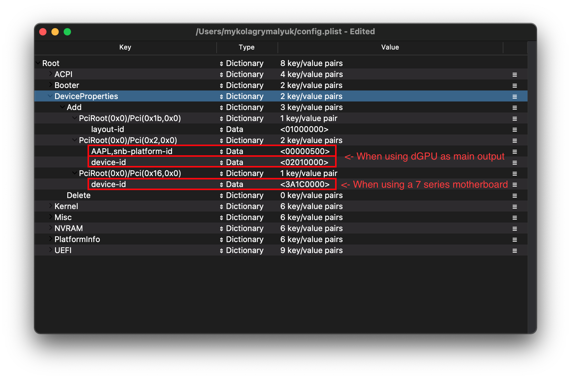 The AAPL,snb-platform-id is what macOS uses to determine how the iGPU drivers interact with our system, and the two values choose between are as follows: