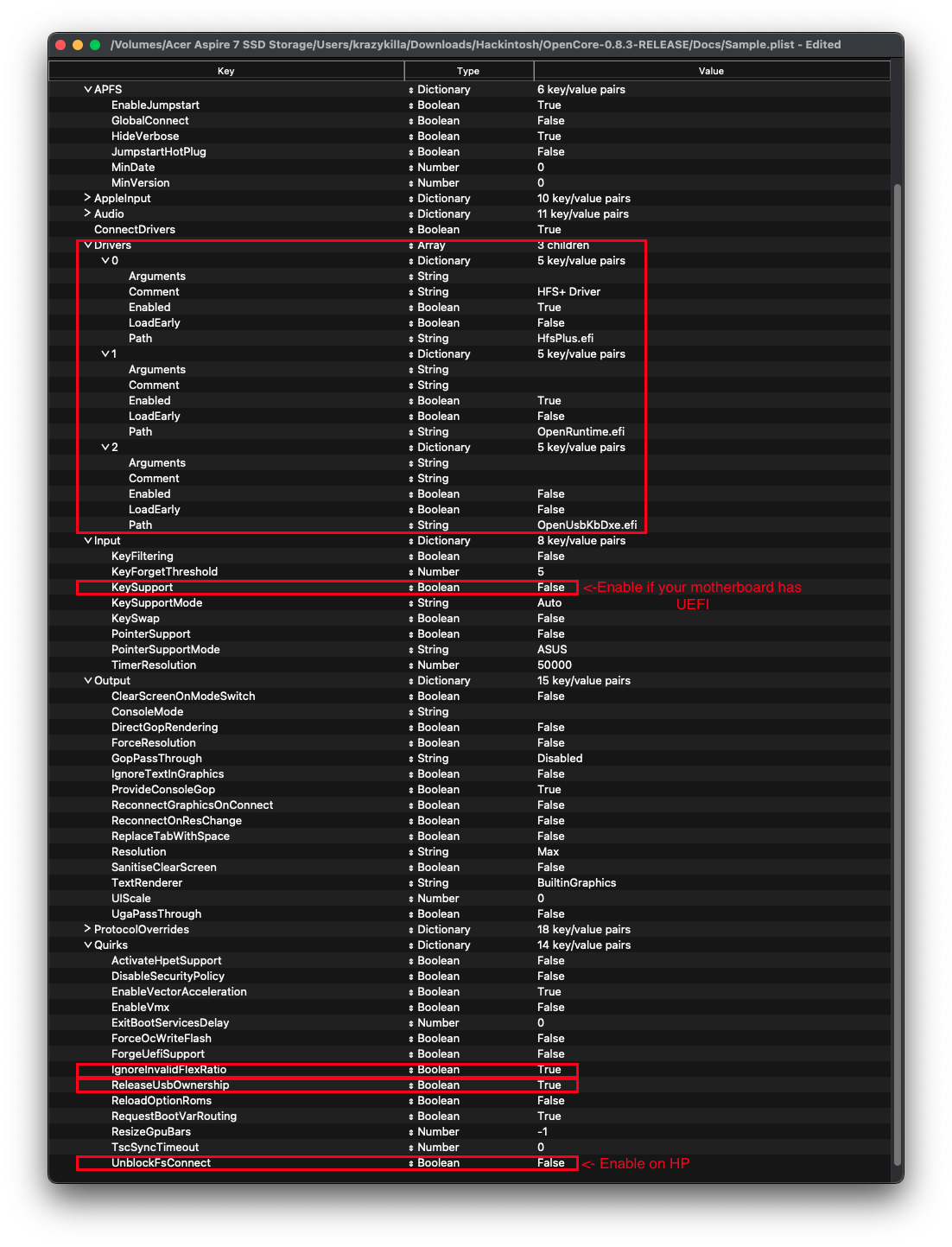 - All properties must be defined, there are no default OpenCore will fall back on so do not delete sections unless told explicitly so. If the guide doesn't mention the option, leave it at default.