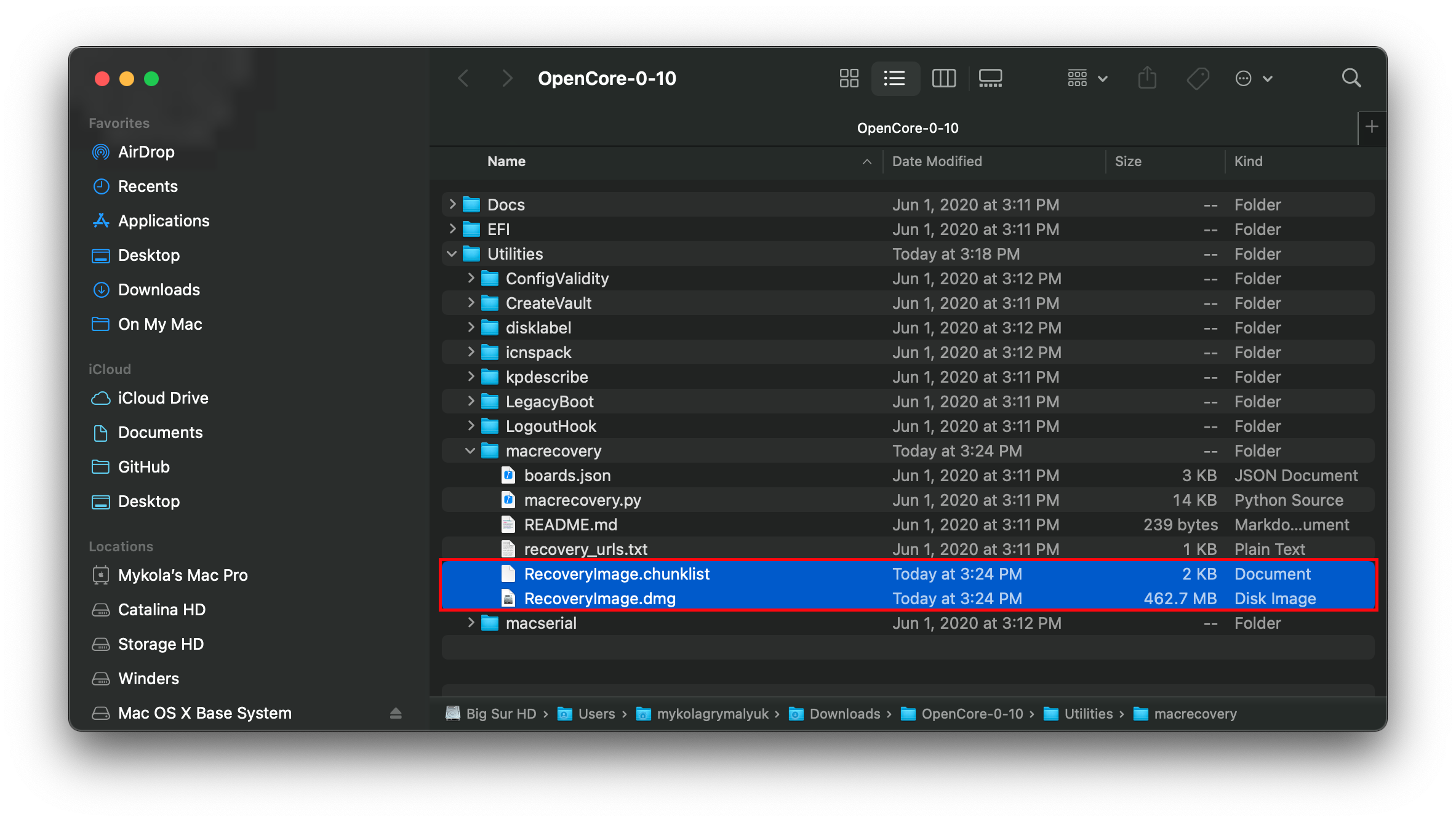 cdto/OpenCore/Utilities/macrecovery/and you should get to a.dmgand.chunklistfiles- mount your USB partition with
