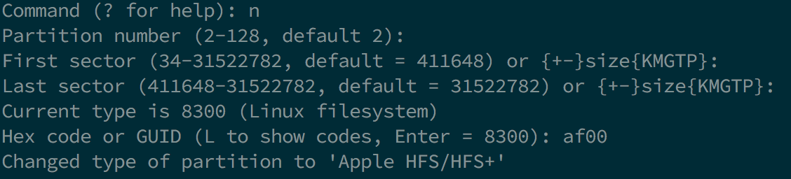 npartition number: keep blank for defaultfirst sector: keep blank for defaultlast sector: keep blank for whole diskHex code or GUID:0700for Microsoft basic data partition type