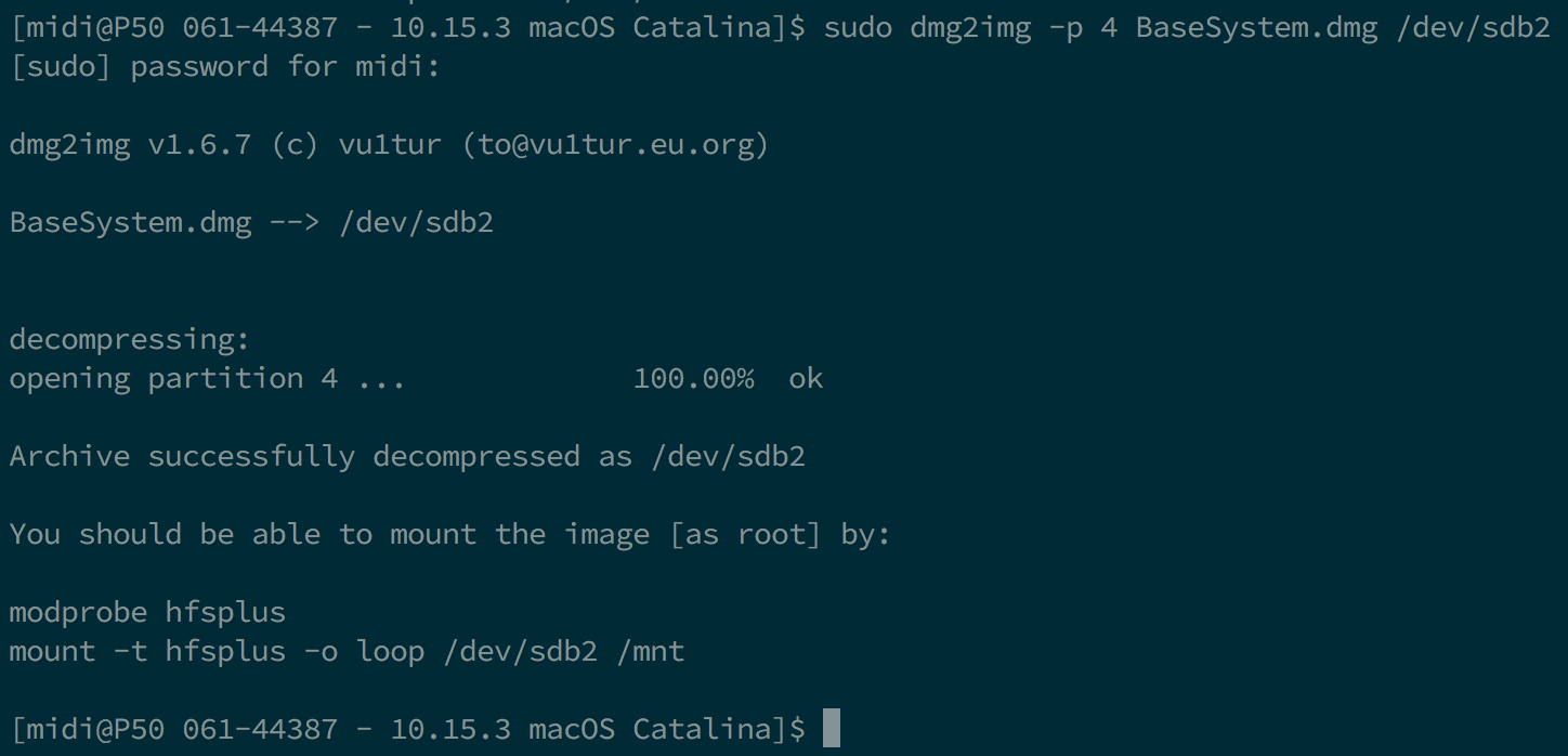 sudo dmg2img -p <the partition number> BaseSystem.dmg /dev/<your 3GB+ partition block>to extract and write the recovery image to the partition disk- It will take some time. A LOT if you're using a slow USB (took me about less than 5 minutes with a fast USB2.0 drive).